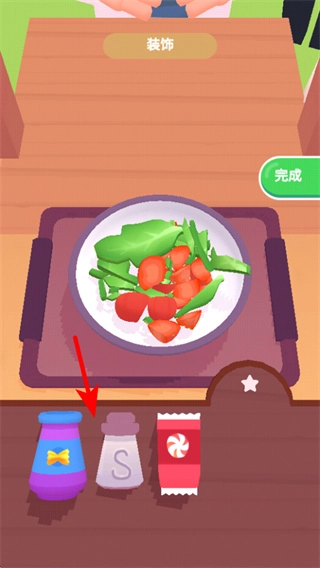 3、在装饰阶段,选择合适的调味料如酱料添加到菜品中,丰富菜品的口味外观,调整好装饰效果点击完成,提升菜品完成度顾客满意度。