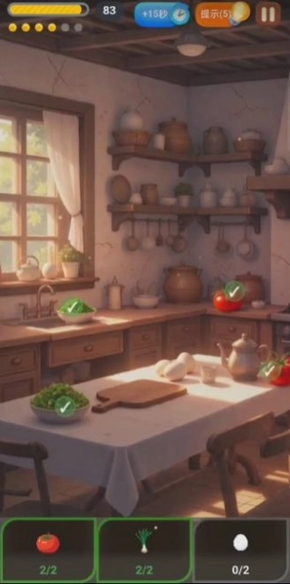 1、进入关卡后观察场景,在细节中找出隐藏的食材,将它们收入背包。