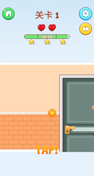 2、关卡1中通过不停点击屏幕的操作方式,积累金币奖励,推进闯关进度。