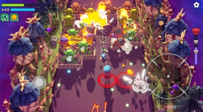 操作上靠虚拟摇杆控制角色移动,右侧瞄准按键调整弹珠弹射角度,新手入门没什么门槛。