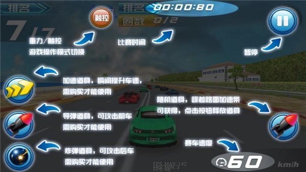 1、通过精致的3D建模、炫酷的加速特效与动感的背景音乐设计,营造出紧张刺激的竞速氛围;