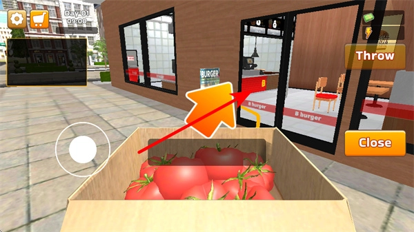 2、游戏中打开纸箱后,点击Throw按钮,可将箱内食材投放到店铺指定区域,完成入库流程。