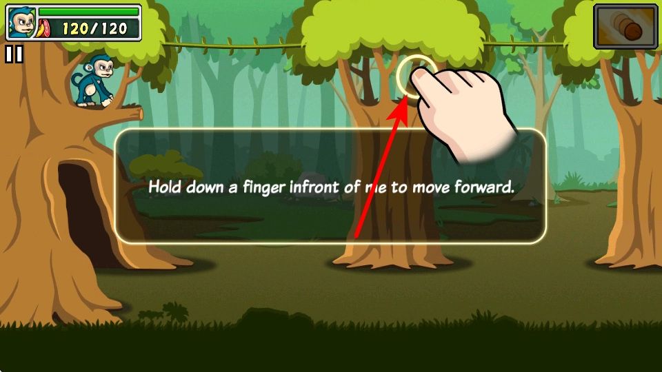 2、在丛林场景中,长按屏幕前方区域,可操控猴子向前移动,这是探索场景、推进进程基础操作,持续长按控制移动。