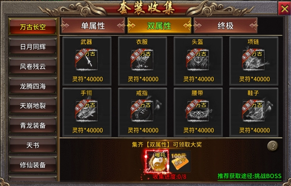 边打怪升级边收集套装,完成套装收集还可以获得充值卡、专属装备、神技等奖励。