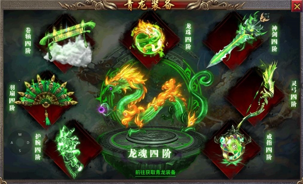 青龙装备可通过击败跨服BOSS获得,每件青龙装备都有高额属性加成,穿上一整套还可以获得更高套装属性。