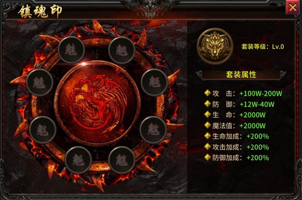 可以通过击败魔界地图【森罗鬼域】怪物获得镇魂印,装备一整套镇魂印可以激活额外套装属性。