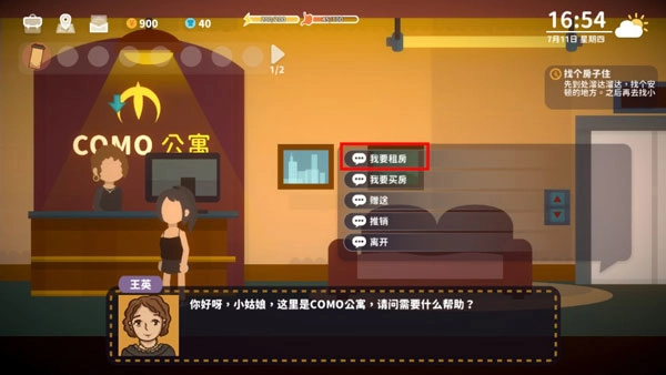 2、进入公寓,与前台王英进行对话,选择“我要租房”