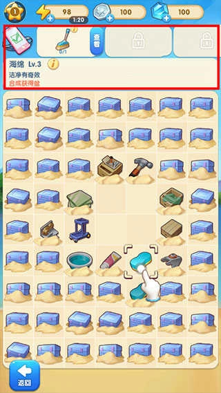 7、通过不断合成,获得经验,解锁被沙子封住的格子,红色区域是已解锁乐园当前所需,可以按照指示合成。