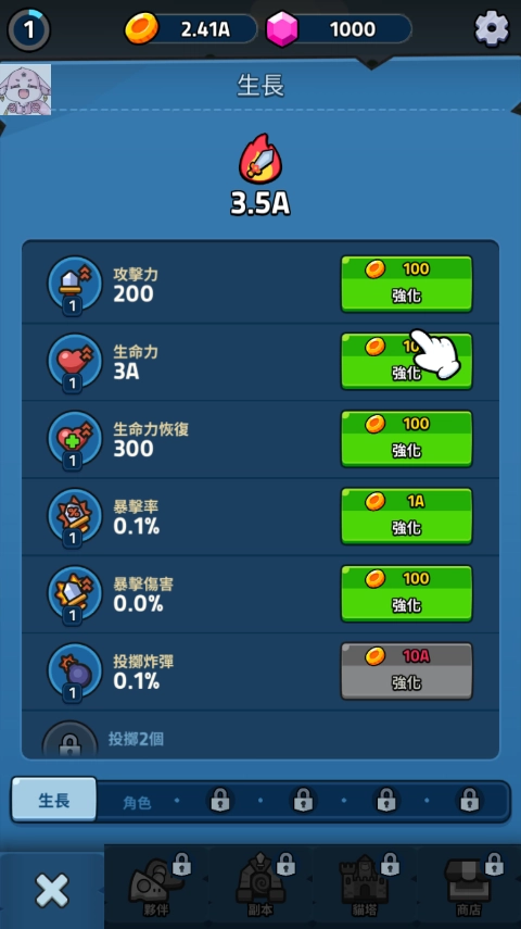 3、想要升级就要不断强自己,让攻击力、生命力、伤害率等强化。
