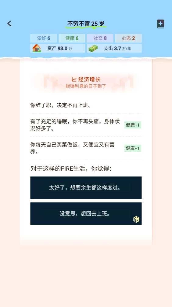 在《躺平模拟器》这款游戏中,玩家得以挣脱时间的束缚,沉浸式体验无拘无束的游戏人生。游戏开局,玩家可依据个人偏好设定初始状态,这一选择将直接左右剧情的发展脉络与最终结局。部分关键抉择还需通过20面骰子来决定命运的走向。