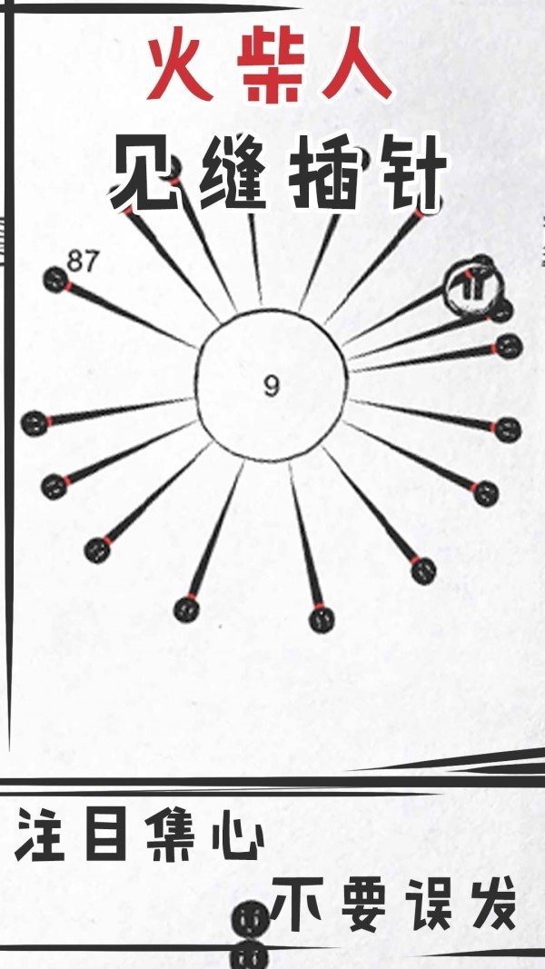 2、在缝隙中发射细细瘦瘦的火柴人针,越插越多之后,越到后来越有挑战性。