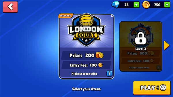 5、点击PLAY即可开始排球经济,玩家能够选择不同的难易度进行挑战,获胜将能够获得金币奖励。