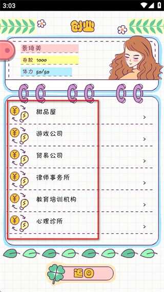 3、在创业选择界面,选择想要经营的行业,如甜品屋、游戏公司等。