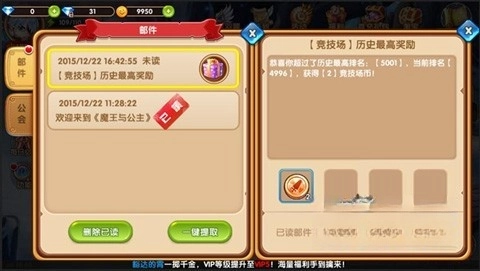 胜利归来的奖励会通过邮件送达,别忘了查看喔!