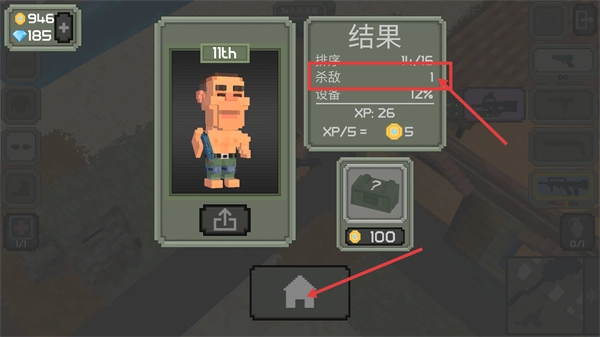 4、结算界面查看【杀敌-1】数据,获取奖励后点击主页按钮返回,准备下一轮挑战。