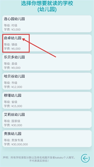2、选择【启卓幼儿园-镇级-学费¥6000】,进入就读确认环节。