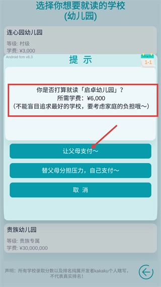 3、在就读提示界面,点击【让父母支付~】,确认就读启卓幼儿园,花费学费¥6000。