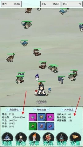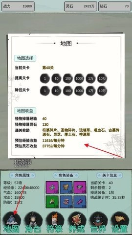 2、点击底部【地图】,可以查看不同区间的关卡通关奖励、经验和灵石收益;