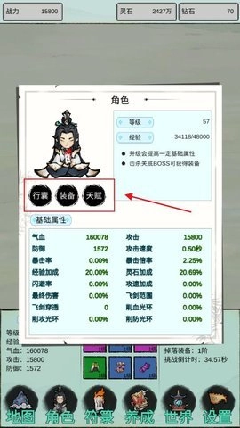 4、行囊是背包,所有收集的材料和装备都会装在这里;装备是刷怪推图获得的装备,可以进行穿戴和洗炼、精炼,没用的装备可以直接分解;天赋可以通过消耗指定材料获得更多天赋,也可以重置天赋。