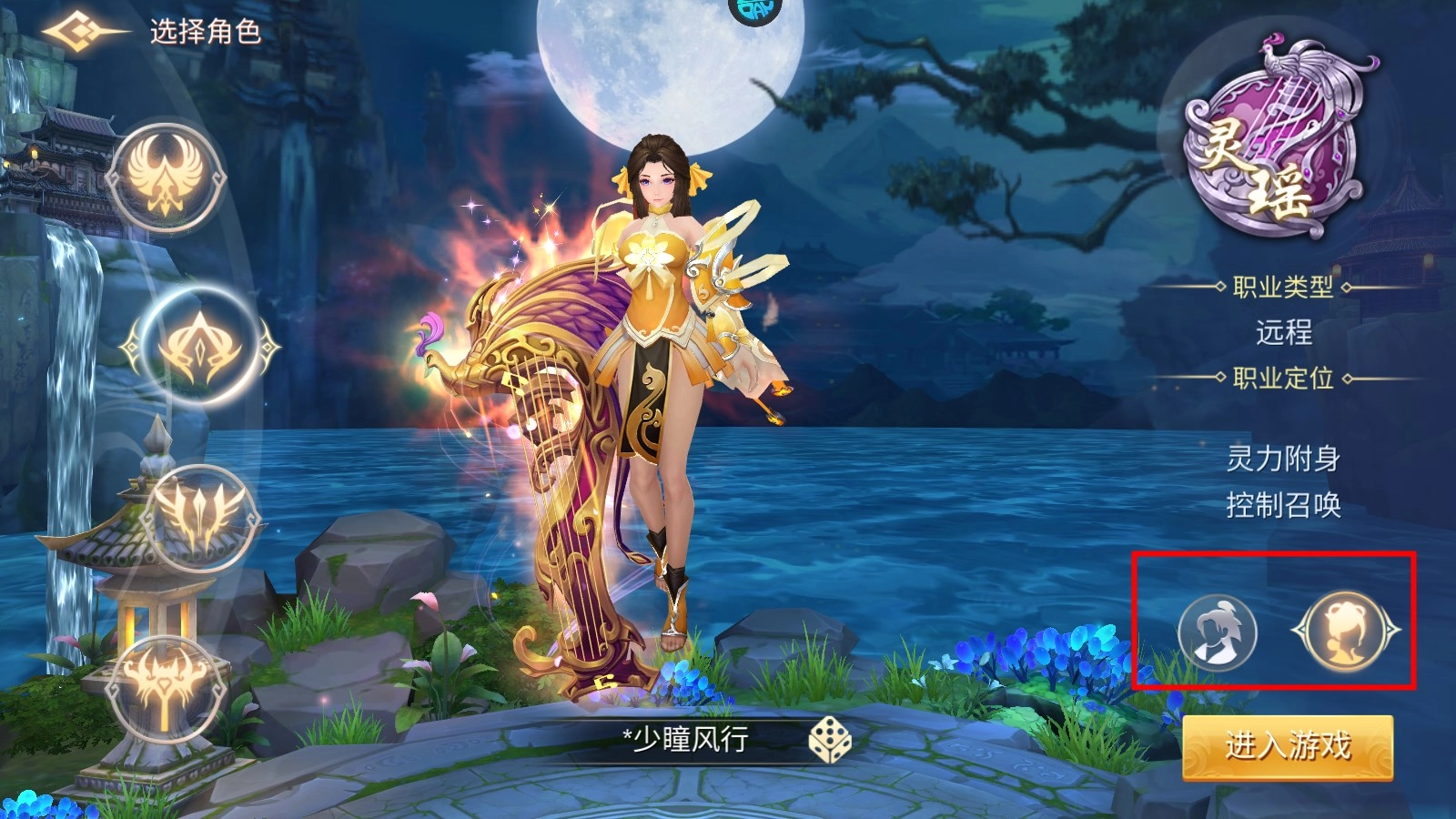 3、第二个灵瑶是远程召唤定位,右下角可以切换性别,每个职业都可以切换。
