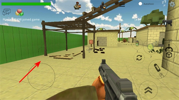 2、游戏中通过左侧虚拟摇杆操控角色移动,这是躲避敌人火力、寻找掩体的基础操作,需注意场景中的建筑和障碍物。