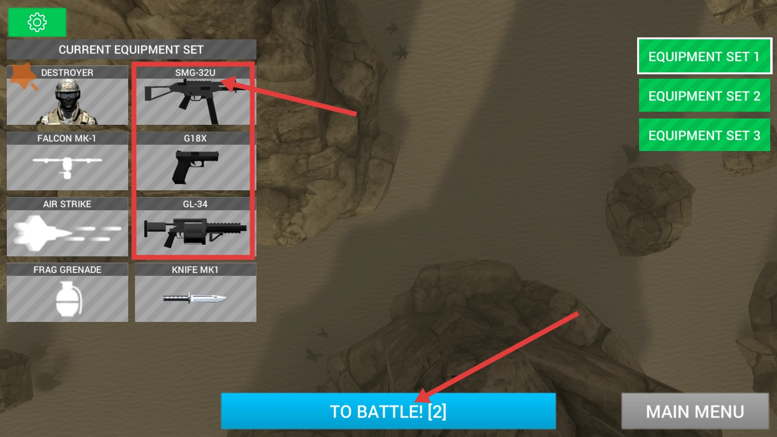 1、在装备界面选择配置SMG-32U主武器、G18X副武器、GL-34第二武器等装备,可根据战斗需求灵活搭配,完成后点击【TOBATTLE!】即可进入沙漠战斗场景。