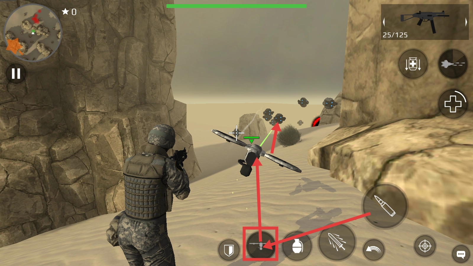 2、进入沙漠场景后,操控角色利用武器(如SMG-32U)攻击机械敌人,留意武器弹药状态,合理使用攻击按键,精准打击敌人。