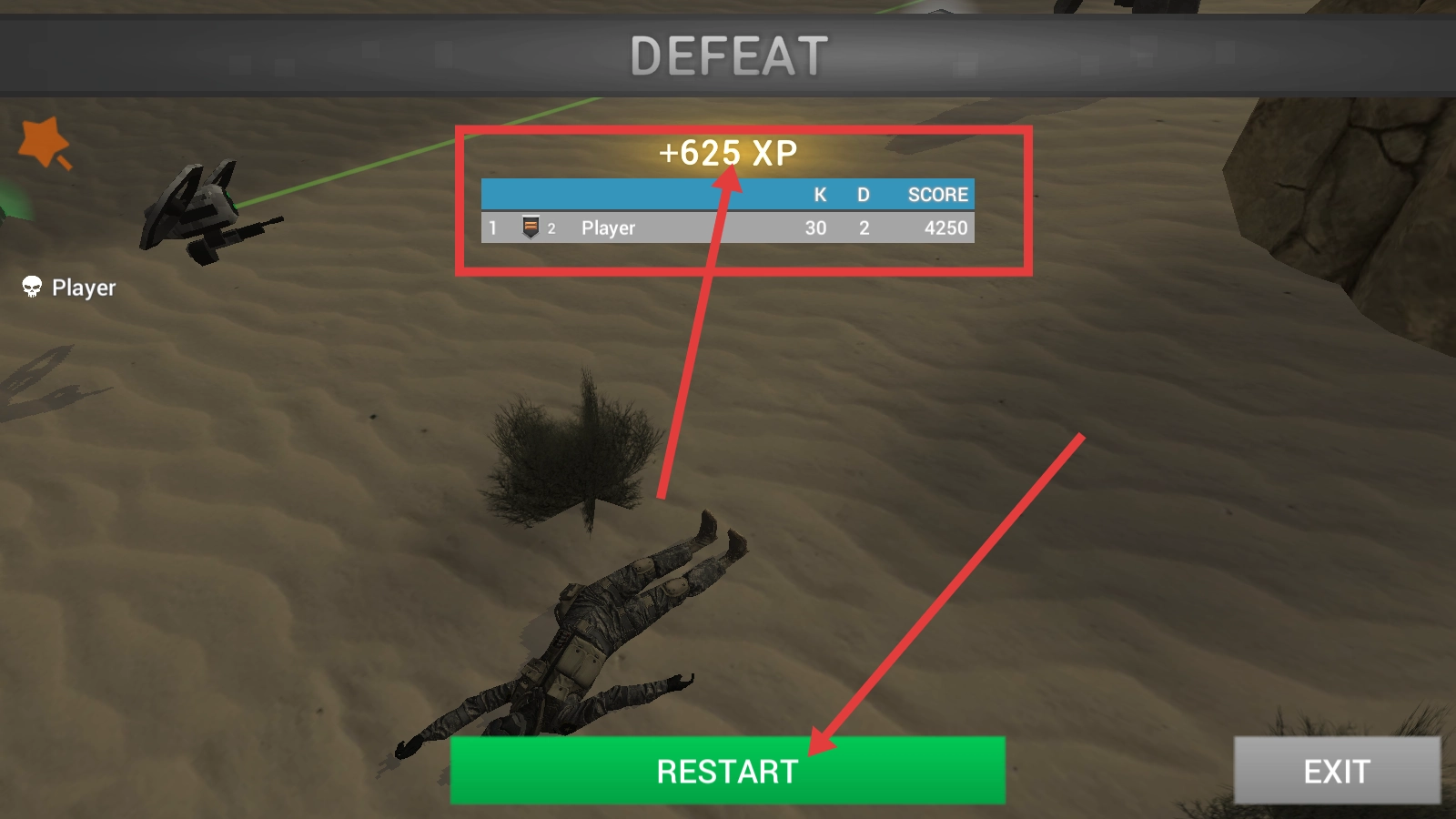 4、若战斗失败,可获得经验值(如+625XP),点击【RESTART】按钮重新挑战,不断优化战斗策略,争取胜利。