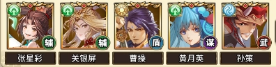 曹操负责吸引敌方前排武将,张星彩可以提高我方输出的生存能力;黄月英和孙策负责打出大量伤害。