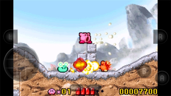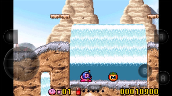 A键的功能是跳跃,再次按下该键角色会在腹中积蓄一口气,进而实现飞行。当角色从相当于2/3个屏幕高度的位置坠落时,会以头部朝下的姿态下落,此时这一状态具备攻击效果。当角色腹部处于鼓起状态时按下B键,会释放出腹中的气体,该吐气动作具有攻击力,不过攻击范围相对较近。而当腹部没有气体时按下B键,则会触发吸气动作,能够将敌人吸入腹中,即便敌人与角色之间有墙壁阻隔,也能成功吸到。若吸入的是拥有特殊能力的敌人,按下十字键的下键,角色就能复制该敌人的特殊能力。要是同时吸入两个敌人后按下下键,会出现能力轮盘供玩家选择;若不主动操作,轮盘会自动停止,此时将随机获取其中一种能力;另外,吸入两个敌人后将其喷出,喷出的星星具有穿透障碍物的效果。如果在吸入能力星星的同时也吸入了敌人,之后再进行能力复制操作,角色将使用的是星星所附带的能力。当角色处于下蹲姿态时按下B键,还能做出滑垒的动作。