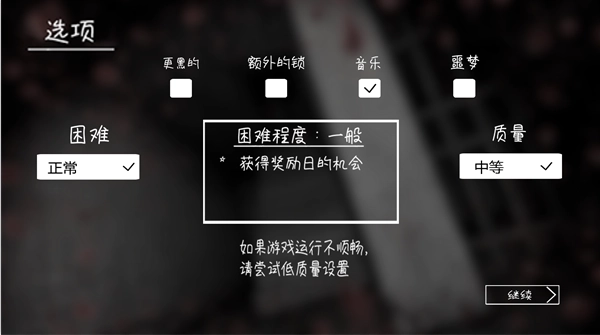 3、容易难度,奶奶走得慢一点,没有吱吱作响的地板,获得奖励日的机会,设置好选项后点击继续,安静点。她什么都听见了,记住如果你把物体扔到地板上,它会发出声音;