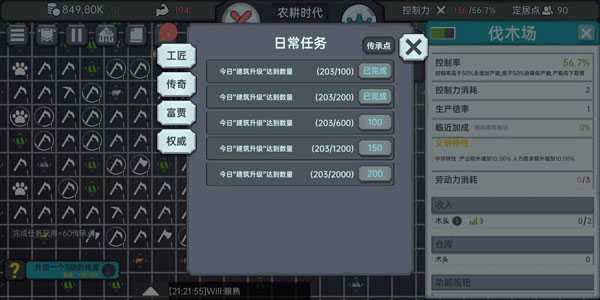 2、石器时代:攒到一定量的钱后,进入石器时代,依然保持控制力为负,通过平铺法(大建造2级建筑,注意-定是2级,不然负控制力的话,产物可能为0)造皮革、木板、石头工具等,完成时代任务,快速进入青铜时代。