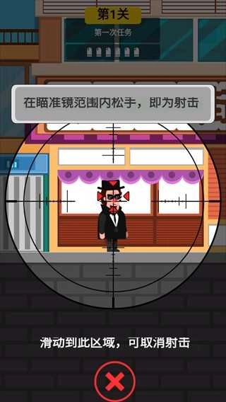 1、游戏的玩法十分简单,点击并长按屏幕就能进行狙击瞄准,当目标处于瞄准镜范围内时松手,即可完成射击。