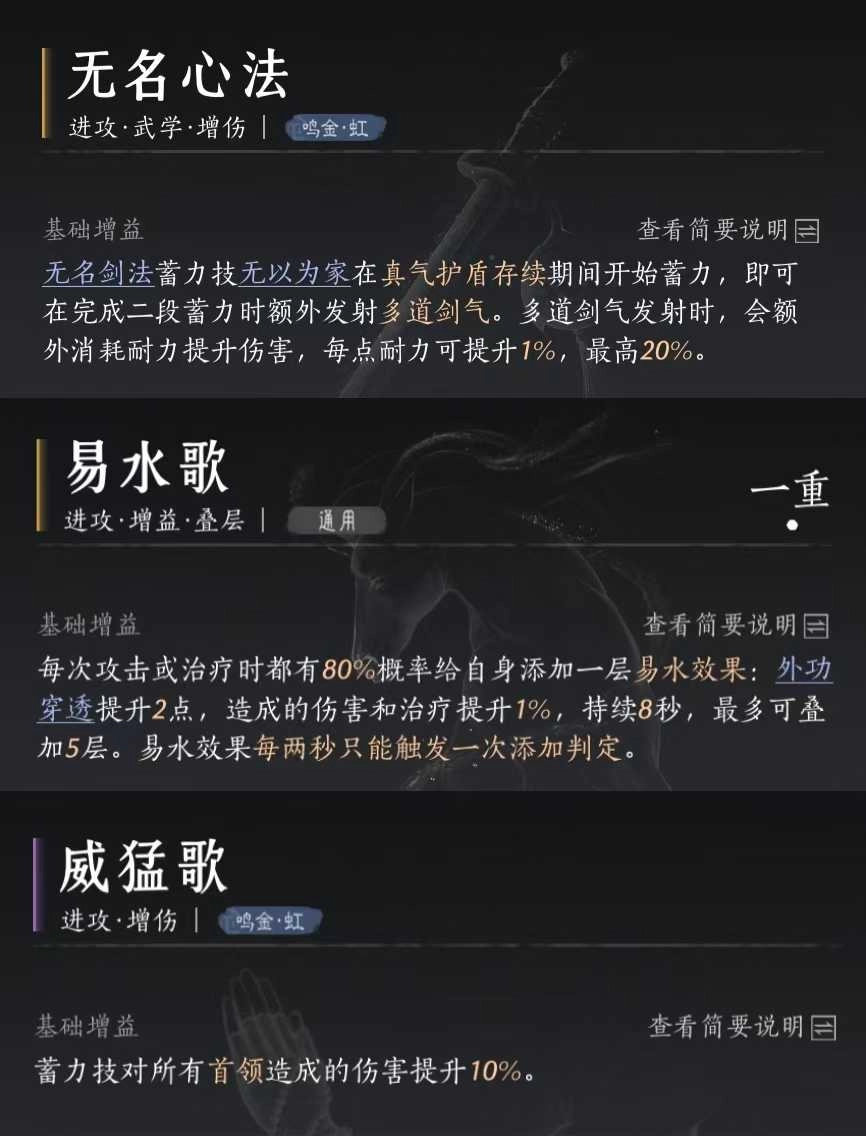 威猛歌:威猛歌可以增加我们蓄力技的伤害,我们无名剑法的主要输出手段就是蓄力的剑气,而且威猛歌在升到一重时可以对所有敌人都增伤10%不仅限首领,非常实用。