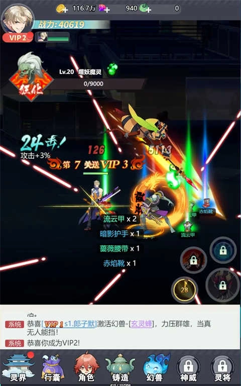 随着功能开启,玩家的第一个强力帮手“幻兽”激活了,幻兽不但可以增加主角的战斗属性,同时还可以在战斗中释放技能,保证连击效果!虽然只能携带一只幻兽出战,但是所有激活幻兽的战力永久叠加,快去游戏中寻觅到更多强力幻兽吧!