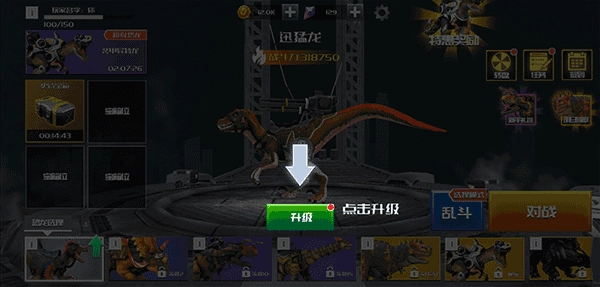 8、另外,玩家还可以在首页恐龙选择中任意选择你要出战的恐龙,也可以将喜欢的恐龙进行升级,升级后的恐龙战斗力会更强哦