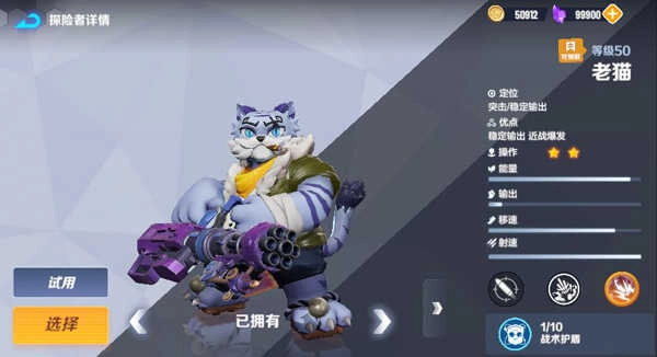 老猫身为一名高频输出的英雄,可以在前排进行持续性的火力压制。老猫发动小技能,加特林短时间内可快速发射50颗子弹,每颗子弹造成30点伤害。
