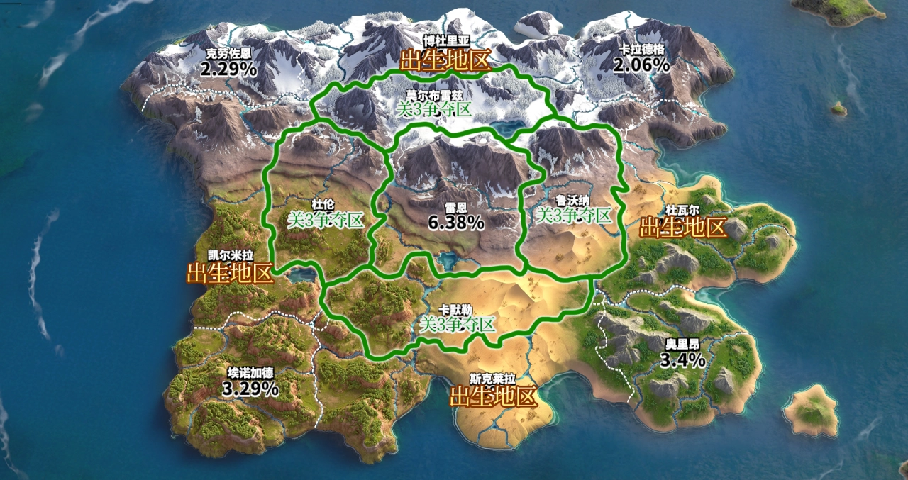 S2赛季中,出生地区由原本的三个增加到四个,因此链接出生地区的过渡地区也由变三个成了四个,同理,资源地区也变为了四个;最终的争夺的地区保持不变,仍然为一个;同时在S2赛季中,关1、关2、关3均为永久半开放关卡,仅占领了关卡归属区域内任意魔兽巢穴的联盟可以进攻该关卡,可以简单理解为,出生地区是不会被敌对领主攻占的。