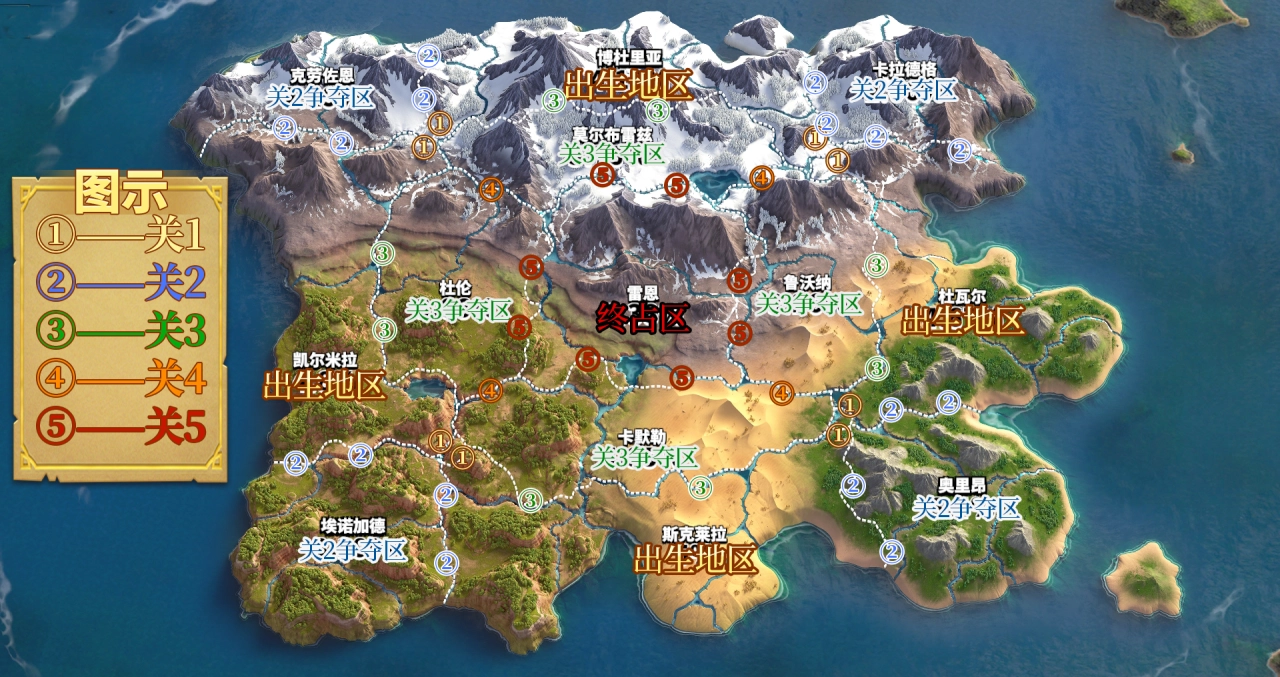 S2赛季,关卡位置分布与S1也有很大差别:S1赛季中,通过关1后将会拥有一个全新地区作为争夺区;而S2赛季中,通过关1后则会开启全新可争夺的地区界【符文先祖雕像】(关于雕像的详细介绍见后文),通过参与争夺并持续占领此地区界,领主们将可能获得大量奖励。