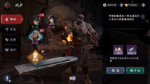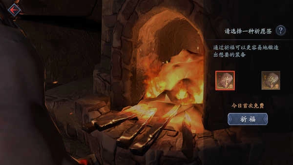 玩家通过消耗锻造材料来获取装备。锻造可选择“学徒锻造“和“名匠锻造”,名匠锻造出精品至珍品的装备或碎片的概率高于学徒。锻造前,每天玩家可以免费祈福一次,通过消耗三种不同的祈愿签,获取锻造装备的优势状态加成。