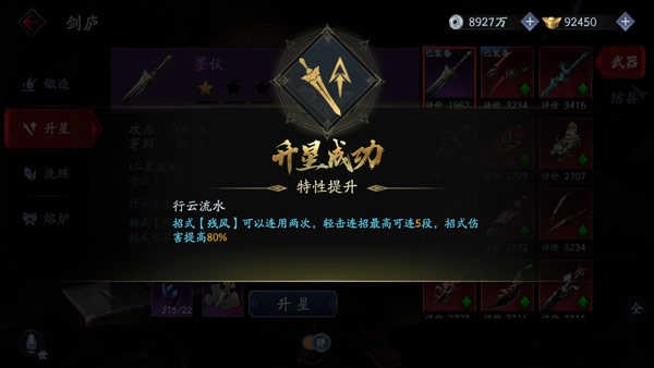 玩家可以通过升星系统,消耗材料将某件武器或防具进行特性强化,在应对敌人时更加自如。