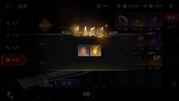 玩家可在“剑庐“界面获取、强化和回收装备。