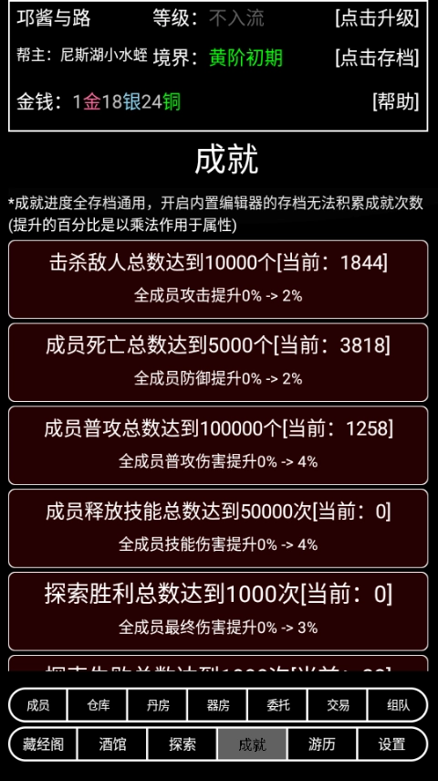 帮派养成安卓完整版是一款主打文字MUD玩法的模拟经营游戏,玩家在游戏里需要用心打理自己的帮派。借助文字呈现的丰富描述,玩家能清楚掌握帮派内的各类事务与功能,通过合理规划推动帮派稳步发展。
