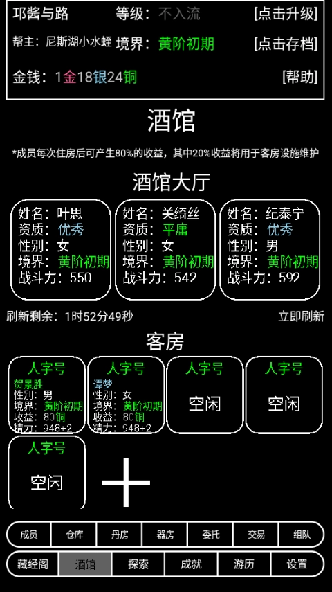 5、酒馆房间的管理至关重要,不要让能住的人打地铺,这样不仅浪费资源,还影响恢复精力的速度,进而降低后续探索的效率。房间的升级和丹药、炼器也同理,要确保每个房间都有充足的空位。