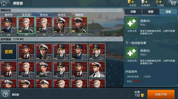 2、除了这些加成以外,一些水兵还带有着相当于特殊技能的存在,比如说拯救这个特殊技能,拯救的特殊效果是当我军有舰船被敌方击沉时,通过拯救我方落水的友方水兵,自己的血量会获得少许的提升。