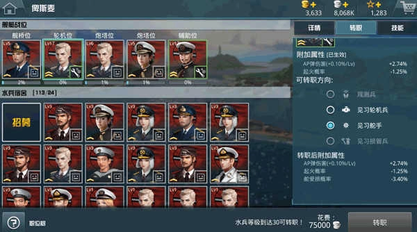既然提到了转职,转职可以让乘员更加强力,同时附加其他的被动属性也十分可观,转职方向也决定了附加能力的属性,例如见习舵手可以提高舰船受损概率等等一些提高生存性的技能,同时减低起火概率,提高AP弹的伤害等等十分重要的加成。