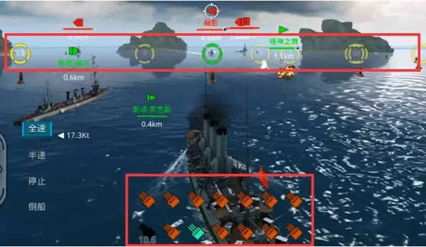 《战舰猎手》的航行操作是通过上下速度档位和左右方向键来实现的,玩家只需要通过上下键在全速、半速、停止、倒船四个档位中进行选择,使用左右键任意调整方向就可以实现战舰的航行,简单的操作却能让你体验真实的战舰航行,同时在精简的操作下,玩家可以将视野和精力更专注于找寻敌方战舰与战斗中,享受海战带来的激情。