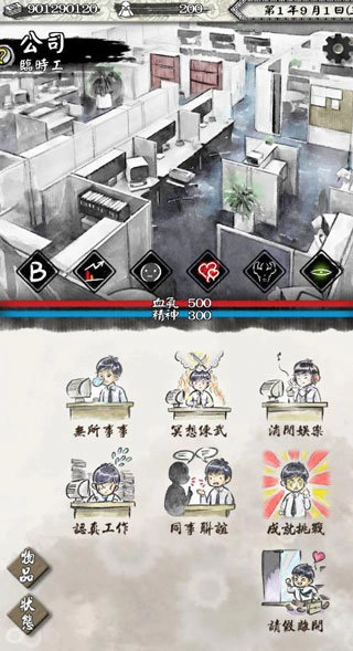 心情状态会影响业绩收益,但影响幅度不大,尤其到了中期(如第二年),这种影响更加微弱。在周末完成一次工作后会出现选项,可以用极低的成本进行属性提升;此外,外出闯荡江湖、惩恶扬善也会有机会增强属性。(如果敌不过对手,请尽快逃跑,否则会大幅降低心情和健康值,逃跑虽然不成功但仍能获得阅历和心情加成)