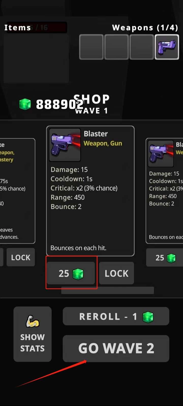 6、使用绿色的晶体购买武器,然后进入下一波战斗。