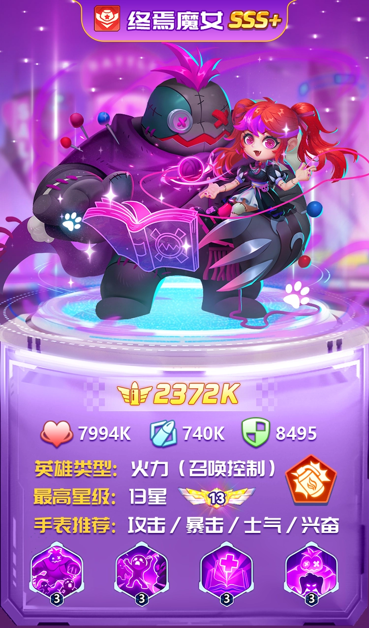 召唤流本次上大分,终焉魔女的出现让召唤流的强度瞬间大幅度提升,且具有优秀的输出面板,是当之无愧的T0级别火力英雄。大家都说不会打控制的输出英雄不是强力英雄,终焉魔女可以说是十分完美,叠加诅咒层数完成的直接击杀像是外挂式的输出,其技能产生的【恐惧】状态可限制攻击和回能,配合召唤物代替自身死亡存活能力再上一个档次。兼顾输出、控制和续航,她不上阵谁上阵呢?